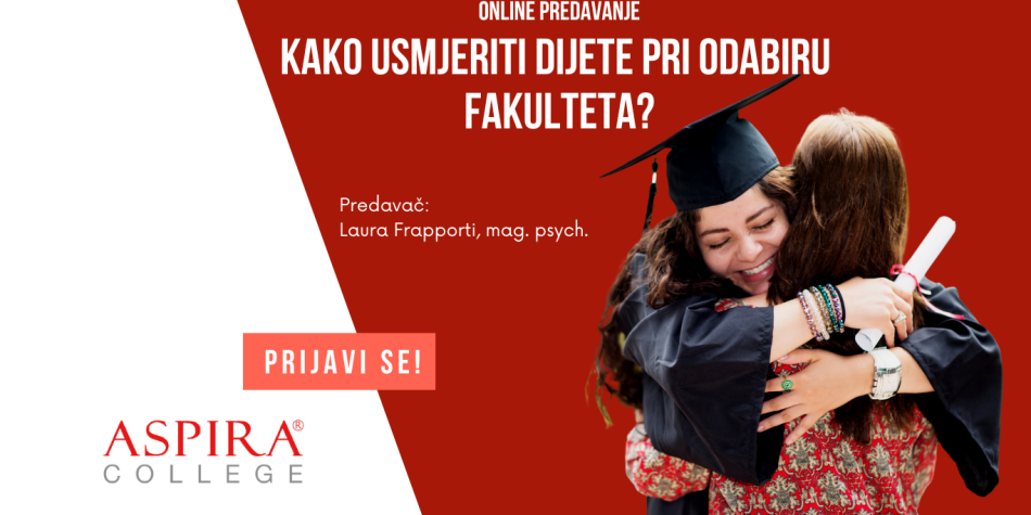 Roditelji imaju veliki utjecaj na život svoje djece. Međutim, kao i djecu, ponekad i roditelje treba usmjeriti. Koji je najbolji način za to? Kako djetetu približiti izbor, a ne ga udaljiti? Zanima vas kako pomoći djetetu da odabere pravi fakultet za sebe, ali ne znate kako? Ne želite mu nametati svoje mišljenje, ali isto tako ne želite ni da napravi pogrešku? Kako uzeti to dvoje u obzir i pronaći zlatnu sredinu? Odgovore na ova pitanja pružit će vam Laura Frapporti, magistra psihologije i koordinatorica Centra za poslovne karijere i podršku studentima i nastavnicima Visoke škole Aspira.